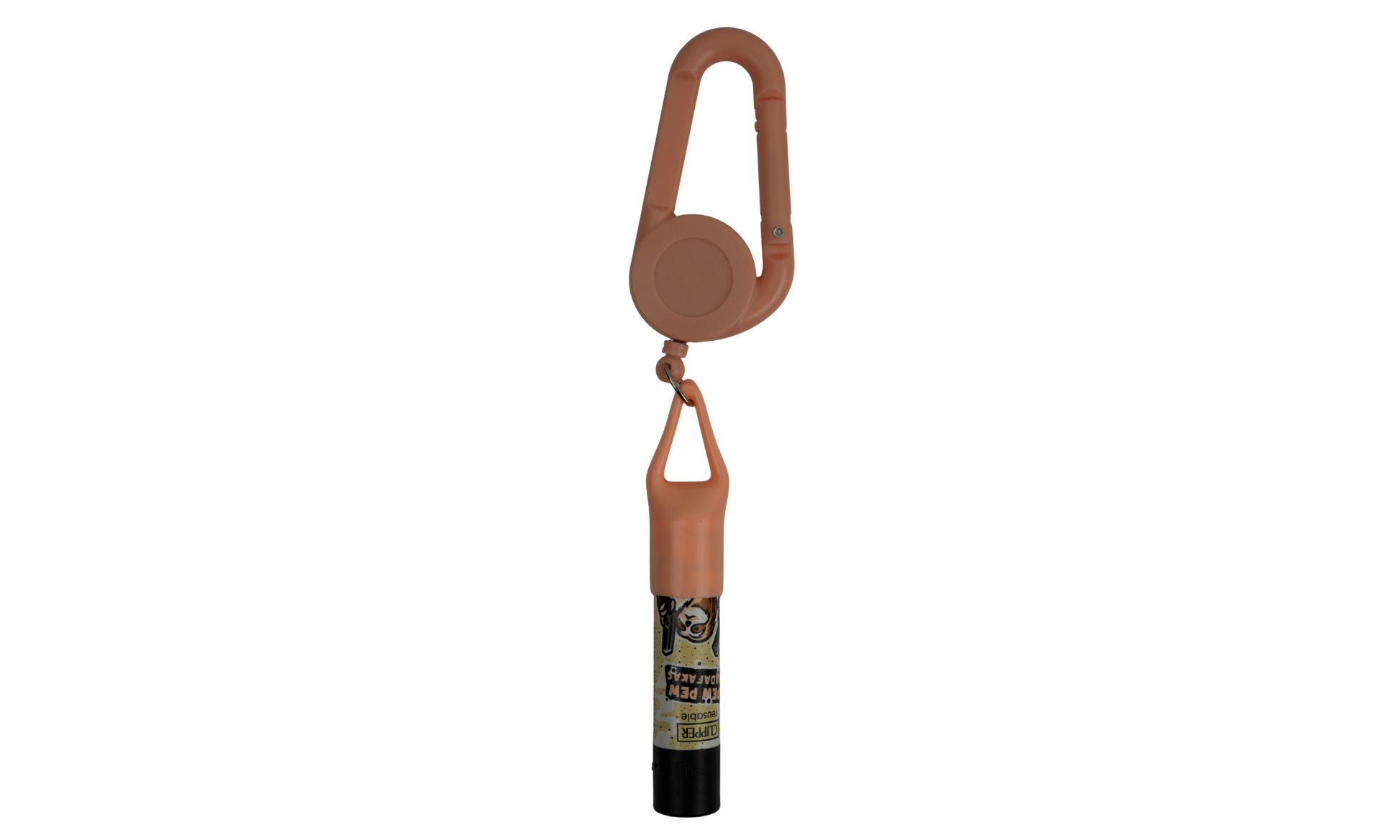 Se engancha con mosquetón a llaves, mochila, trabilla del pantalón o riñonera.